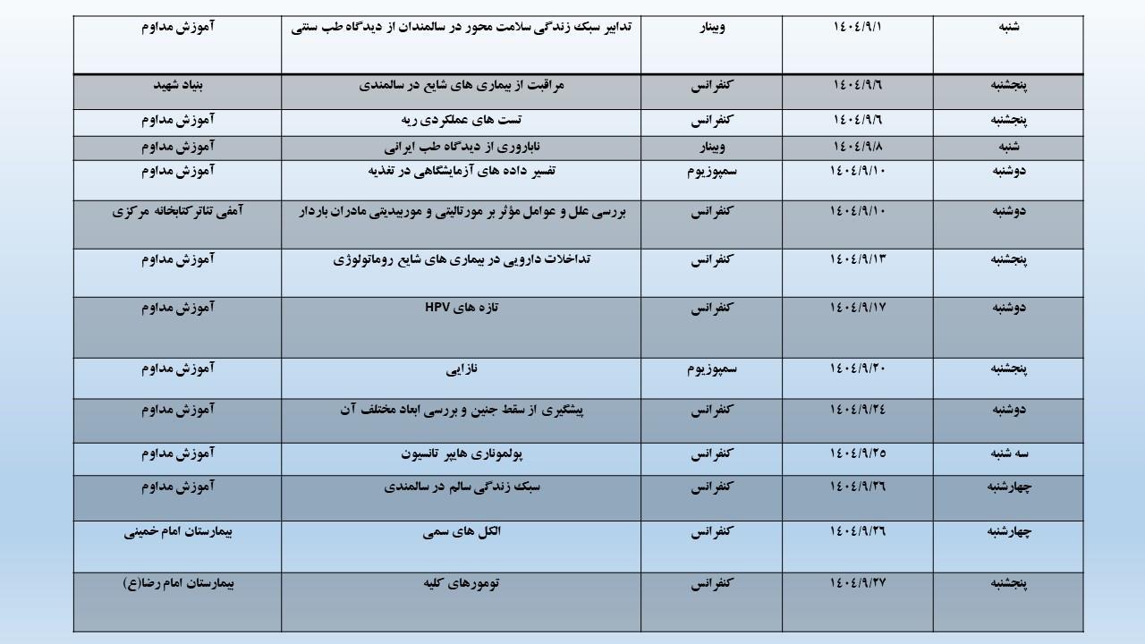 اخبار و اطلاعیه کنفرانس علمی تداخلات دارویی در بیماریهای شایع روماتولوژی مورخ 1404/09/13 در سالن آموزش مداوم ۰۴ آذر ۱۴۰۴ - ۱۳:۰۵ کنفرانس علمی بررسی علل و عوامل موثر بر مورتالیتی و موربیدیتی مادران باردار مورخ 1404/09/10 در سالن آمفی تئاتر کتابخانه مرکزی ۰۴ آذر ۱۴۰۴ - ۱۳:۰۰ کنفرانس علمی تفسیر داده های آزمایشگاهی در تغذیه مورخ 1404/09/10 در سالن آموزش مداوم ۰۴ آذر ۱۴۰۴ - ۱۲:۵۸ لیست برنامه بازآموزی آذرماه ۰۴ آذر ۱۴۰۴ - ۱۲:۴۰ همکار ارجمند و بانوی پرتلاش و دلسوز، مرحومه سرکار خانم معصومه جنتی دعوت حق را لبیک گفته و دار فانی را وداع گفتهاند. ۲۶ مهر ۱۴۰۴ - ۱۳:۳۳ آخرین بخشنامه کمیسیون آموزش مداوم ۰۹ مهر ۱۴۰۳ - ۱۰:۲۶